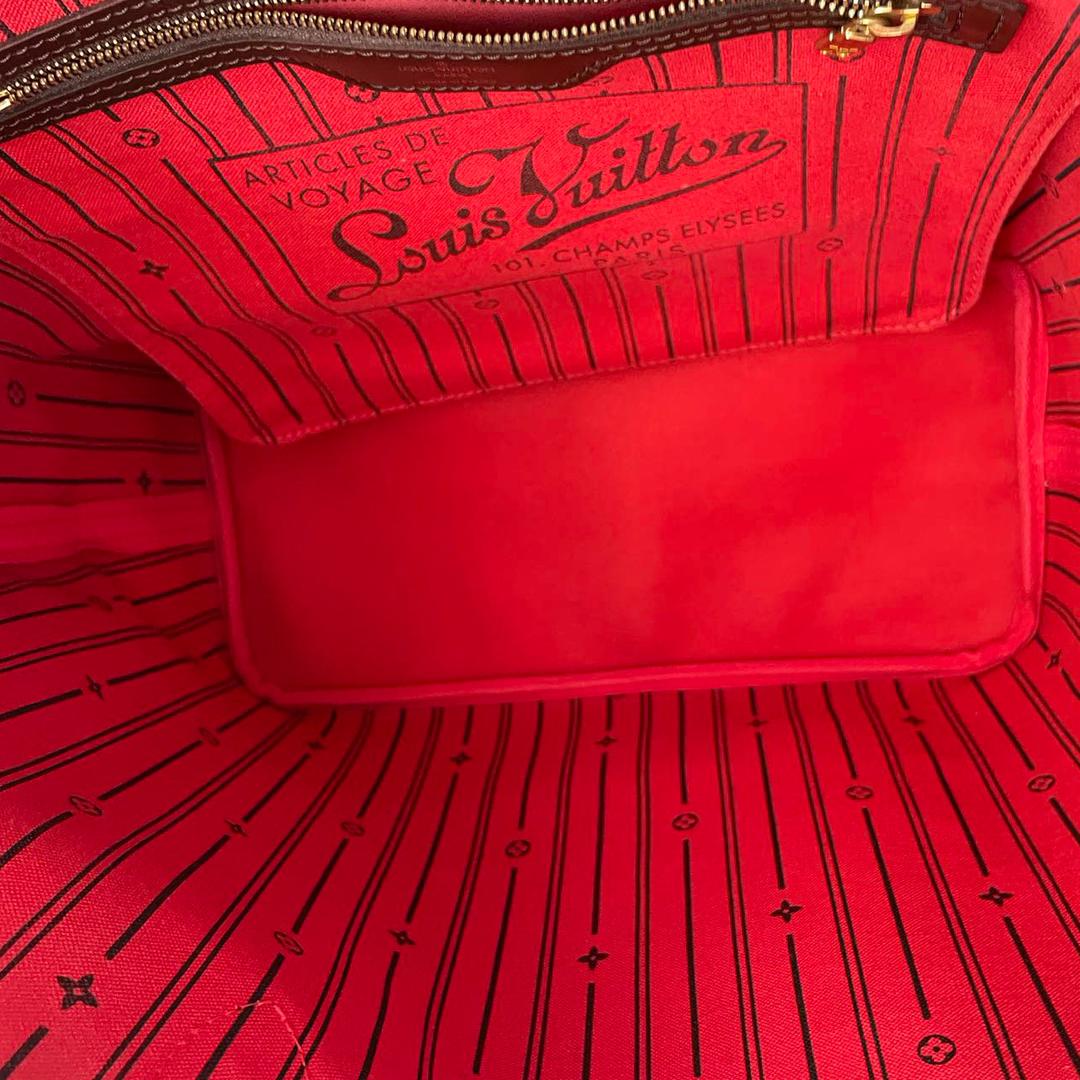 The Louis Vuitton Neverfull MM in Damier Ebene Canvas is the perfect blend of style and practicality. Crafted from durable coated canvas with elegant dark brown leather trim, this iconic tote easily carries your daily essentials in timeless fashion. The spacious interior features a red striped textile lining and a removable zippered pouch that doubles as a clutch. Slim leather handles fit comfortably over the shoulder, making it your go-to companion for work, travel, or shopping.